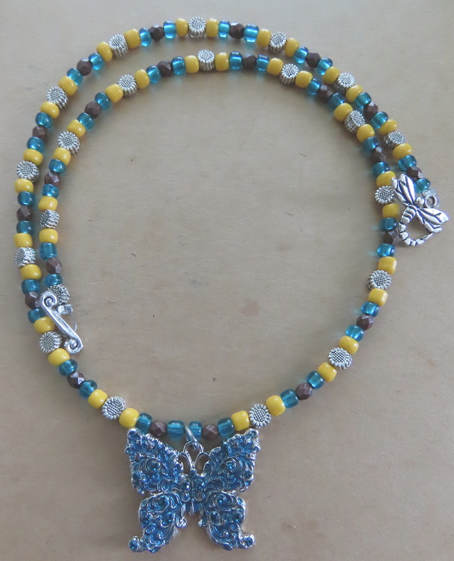I had some small sunflower beads and a sunflower colored E bead tube, so I decided to put those together as well as some blue beads to tie back to the pendant. Because the color contrast between blue and yellow was already strong, I added some brown beads in between to tone it down a bit.