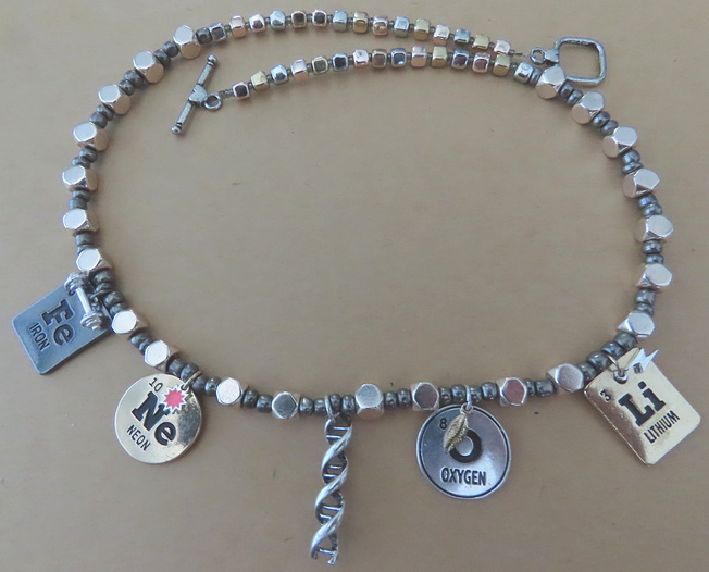 Loved this set of charms and decided to make an all-metal look for it. The large beads are metal, E beads are a gun-metal grey finish, and then it has alternating silver, gold, and copper metallicized plastic cubes. I wanted a blocky look for a building blocks of life theme.